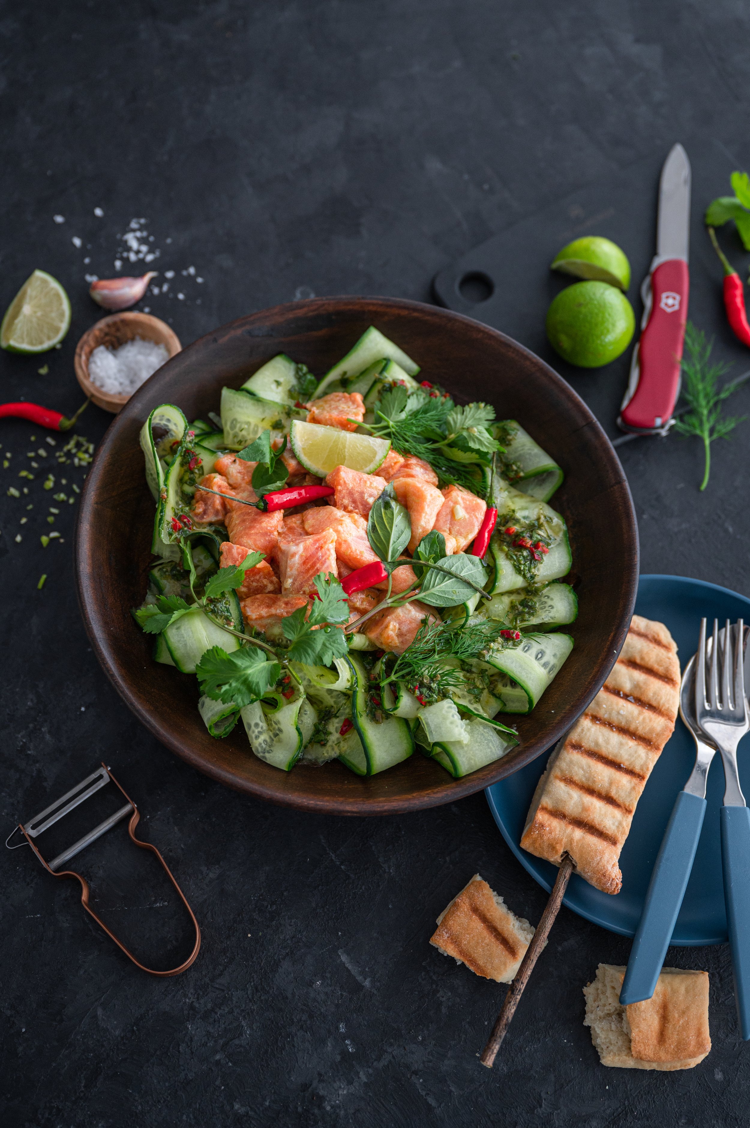 20 Minuten vor dem Servieren die Marinade über den Saibling gießen und ziehen lassen. Dann alles mit dem marinierten Gurkensalat vermengen und genießen.