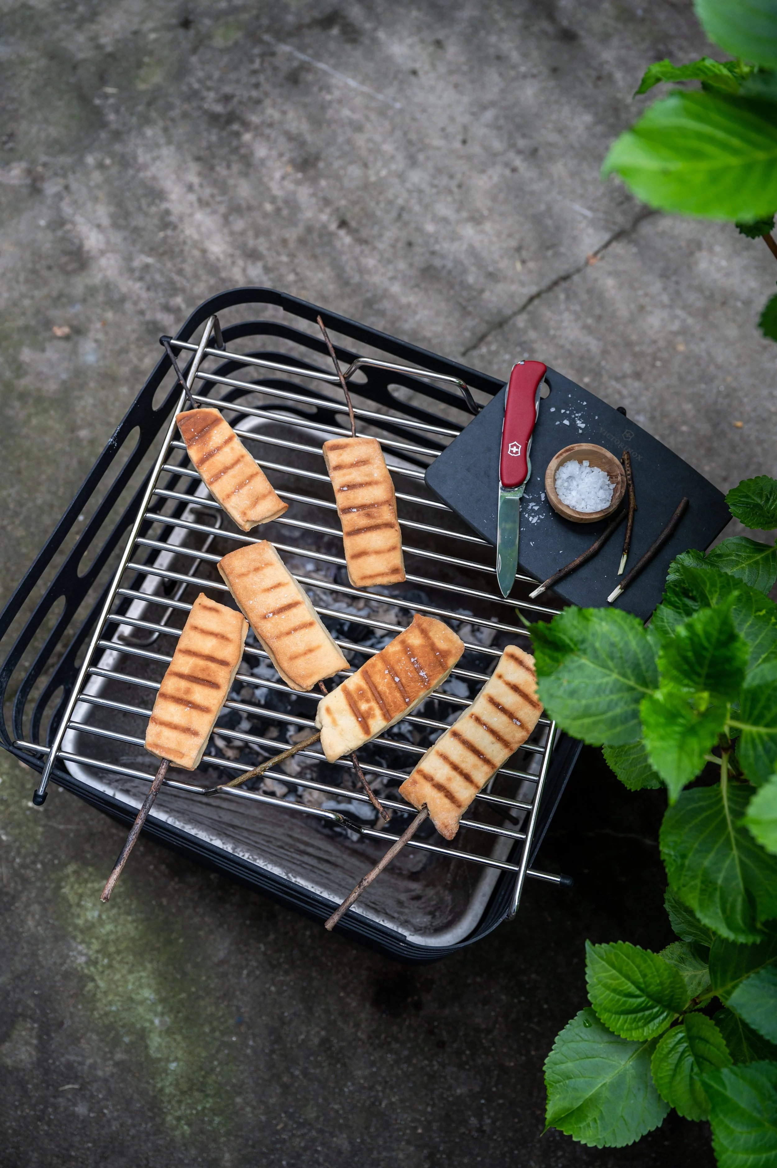 Nun auf der Pergament Seite, ohne weiteres Zugeben von Fett, in einer Pfanne bei mittlerer Hitze beidseitig anbraten. Hier bitte darauf achten, dass die Stücke nicht zu trocken werden. Die Stücke mit einem Holzspieß von der schmalen Seite wie einen Lolli aufspießen und noch am selben Tag auf dem Grill knusprig grillen.